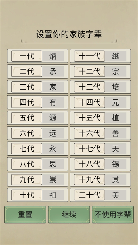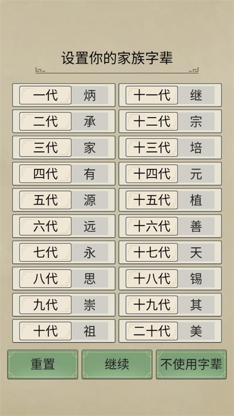 设置自己的家族字辈,点击继续;