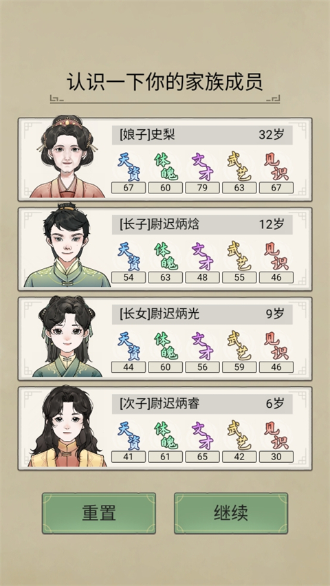 先确认好自己的天资、姓名、体魄、文才、武艺这些属性,要是对当前的属性配置不太满意,随时可以点击重置按钮重新调整。