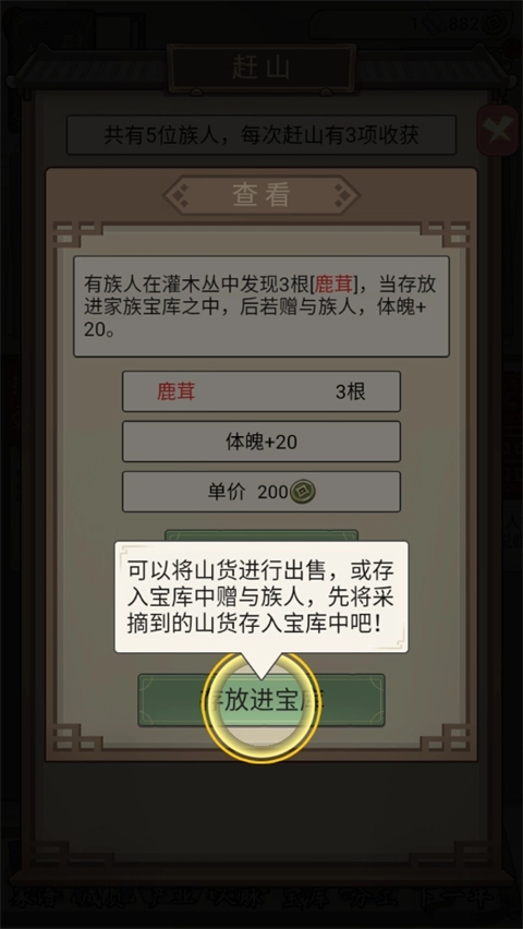 采摘后点击放入宝库,你既可以将山货出售,也可以存入宝库赠与族人。