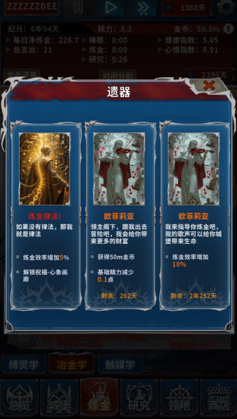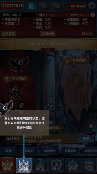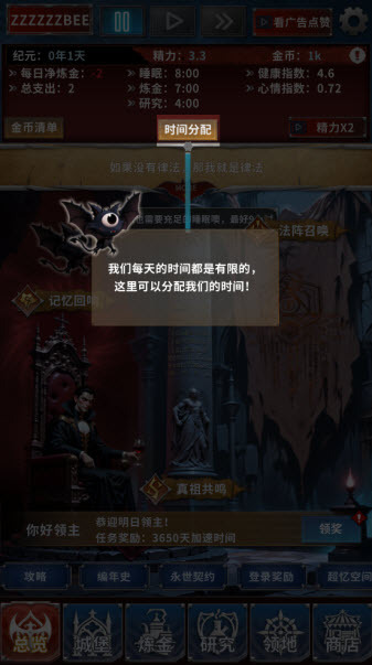 睡眠是重中之重,建议8-9小时。炼金用于产生金币和各类炼金物升级。