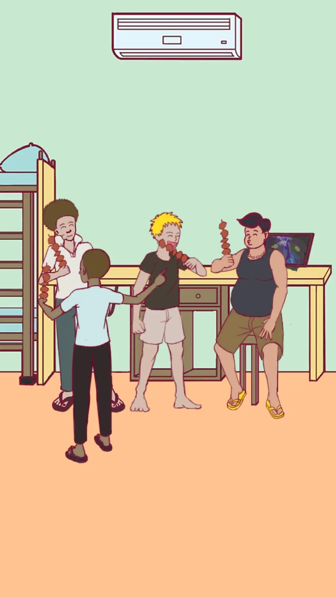 拍一下胖乎乎的室友,把垃圾桶里的葫芦取出来,用它去吸厕所窗户边那个顶着爆炸头的室友;接着把视角转到床铺的爬梯处,手机屏幕上方有个纸角样的东西,点一下就会掉下假发,再晃一晃手机,地中海发型的室友就能通关了。