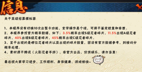 本程序的概率设定如下:S级忍者碎片的获取概率为3.5%,A级忍者碎片为11.5%,B级忍者碎片为40%,C级忍者碎片为45%。