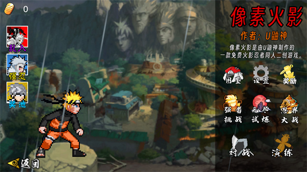 《像素火影》是UP主“u鼬神”独立制作的火影同人游戏,还原了动漫里不少经典角色,像万花筒佐助、秽土转生柱间、大筒木舍人、破面带土、天道佩恩等都在其中。这些角色各自拥有专属忍术,比如神罗天征、神威等,战斗时能快速施放,但每个忍术都存在冷却时间,建议在关键时刻使用,这样就能直接击败对手。