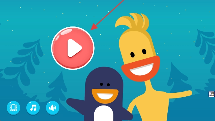 进入那个有着黄色鸭子和紫色企鹅形象的角色互动界面后,点击位于中间位置的红色播放按钮,就能启动游戏里的动画、关卡或者互动模式了。