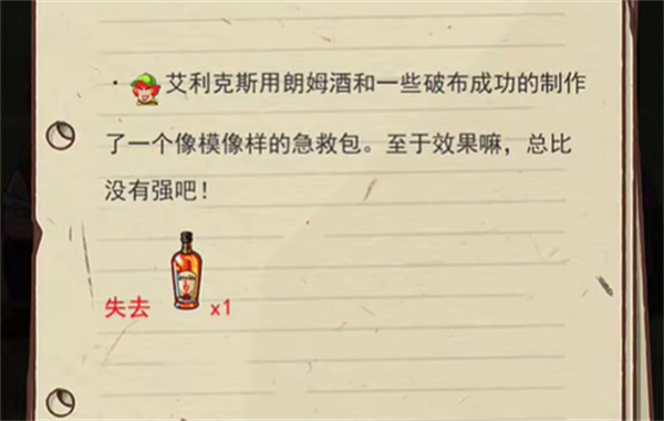 这个兰姆酒能充当急救包,木炭可制成安慰剂,而且还能借助木棍来升级斧头。