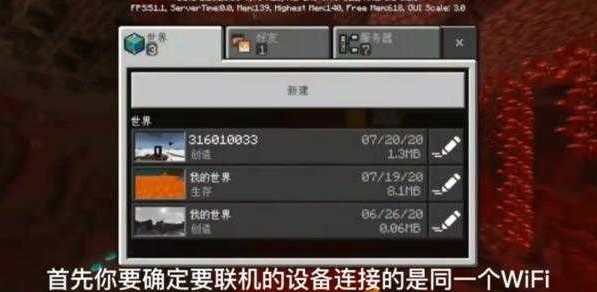首先得确认要联机的设备都连在同一个WiFi上,只要其中一方创建了游戏世界,其他连同一WiFi的好友那边就会显示出来,这点一定要记清楚——必须是同一个WiFi才行。