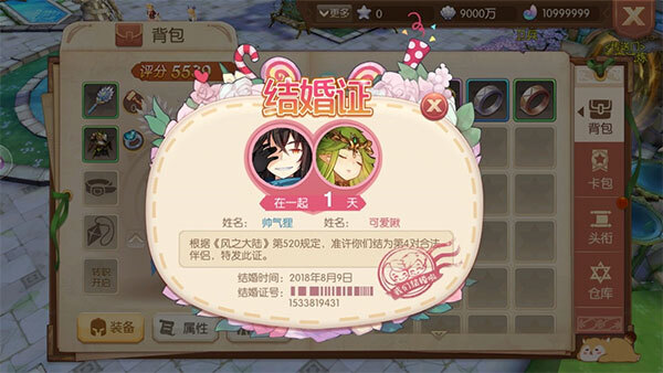 你们的背包里还会有专属于两人的结婚证哦,与此同时,跑马灯会发布公告:恭喜XXX.XXX喜结良缘!这是风之大陆第XX对佳偶!
