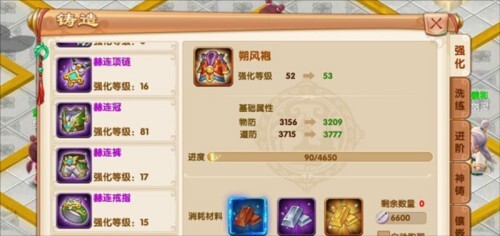 每件装备的初始强化等级都是0级,最高能强化到100级,强化到满级后就不能再继续强化了。装备强化需要消耗强化材料和铜钱,消耗的多少和装备的部件、自身等级没有关系,只取决于当前的强化等级。具体来说,每次强化都会消耗一个强化材料,铜钱的消耗则会随着强化等级的提升而变化。强化效果仅对装备的基础属性生效,采用百分比加成的方式,而且当强化等级达到20级和50级时,还会额外各解锁一个宝石镶嵌孔。