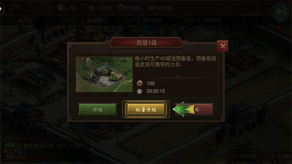 进入游戏后的首要任务是发展自身城池,第一步便是建造民居。民居能够产出预备役,而预备役是武将所率领的士兵,属于最基础的兵种,因此需要大量生产。