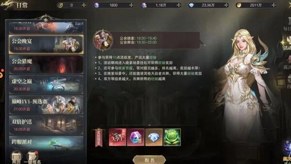 公会晚宴与舞会,既是社交的乐园,也是经验的富矿!晚宴挂机:简单挂机,经验自动获取。晚宴答题:脑力比拼,排名越靠前奖励越丰厚!共舞时刻:邀约伙伴共舞,等级差距越大,经验收益越多!
