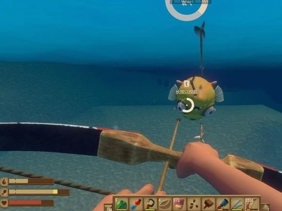 首先我们可以借助雷达导航抵达一座岛屿,接着在岛屿的浅水区潜入水中寻找河豚,这种生物其实不难发现,外形就像一个黄色的圆球,两侧还带着一对小小的翅膀。不过要留意的是,一旦靠近它,河豚就会释放毒液发起攻击,所以我们可以和它保持一定距离,用弓箭射击将其击杀,之后再收集它掉落的爆炸性粘稠物。