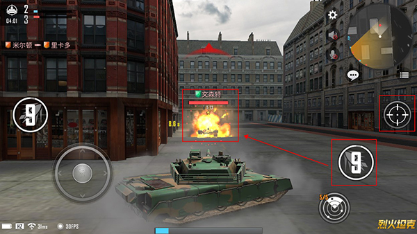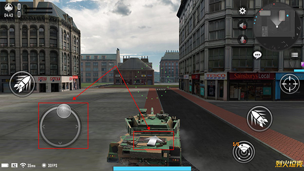 玩家能够借助左侧的轮盘来操控坦克的移动方向,在坦克的中部位置可以看到一个箭头标识,箭头所指向的方向,就是坦克即将行进的方向。