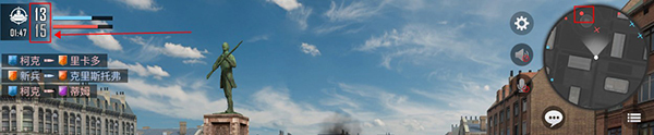 游戏的正常比分会显示在左上角,在倒计时结束之前,哪支队伍先达成人头目标就能获胜;要是倒计时结束时还没分出胜负,人头数更多的队伍就直接赢了。另外,右上角的地图能看到敌人和队友的位置动态,其中红色代表敌人,蓝色是队友,白色则是玩家自己。