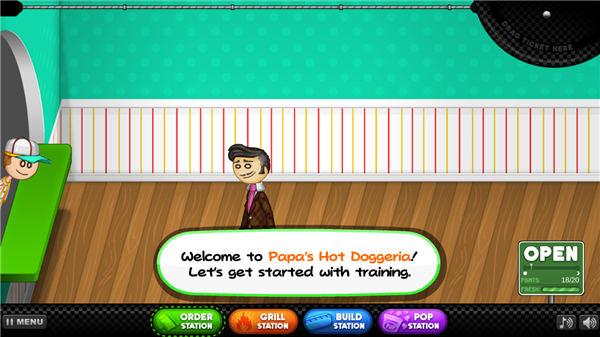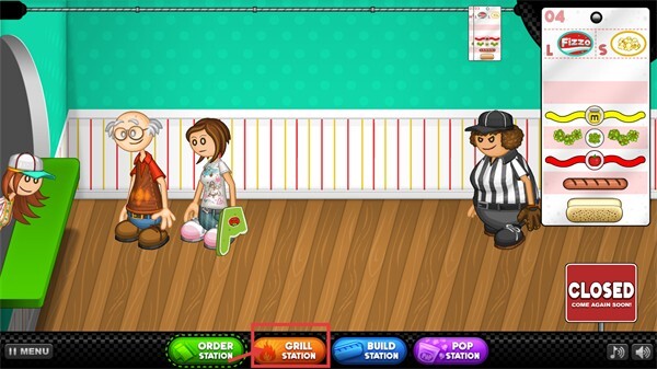 这是《老爹热狗店》的经营场景,观察顾客队列后,点击【CHILL-STATION】按钮即可进入烹饪环节,期间要按照右侧订单来配置热狗的配料。