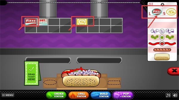 在配餐界面,按照右侧订单的具体要求,选择【Fizzo】饮品和【爆米花】,再与已经制作好的热狗进行搭配,从而完成餐食的组合。