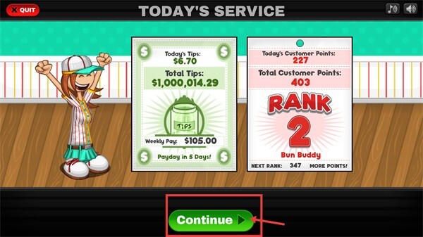 当日营业结束后,系统会呈现【Today's-Tips】之类的收益数据以及【RANK-2】的评级,点击【Continue】按钮就能继续开展后续的经营活动。