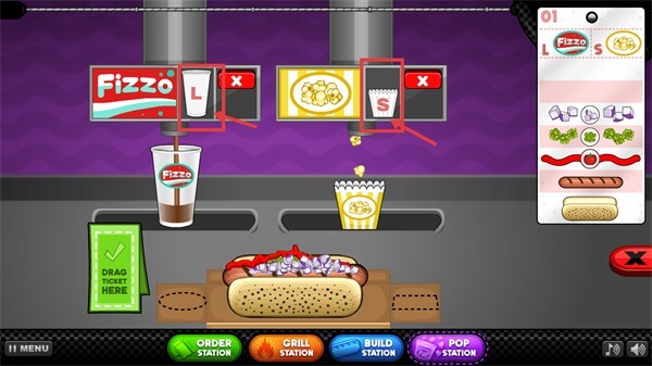 根据订单标识,挑选对应规格的【Fizzo】杯型和【爆米花】包装,把它们与热狗搭配组合,保证餐食符合顾客的需求。