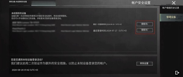 玩家能够对登录账号的安全装置进行管理,既可以撤销已授权装置的权限,也能够对新装置进行授权操作。