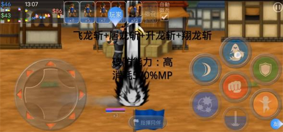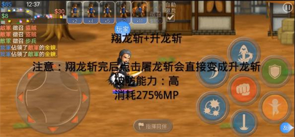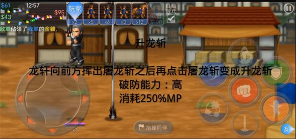 翔龙斩与升龙斩的组合效果如下:先对前方施展翔龙斩,紧接着使用屠龙斩时,屠龙斩会直接转化为升龙斩。该组合破防能力出色,但会消耗275%的MP。