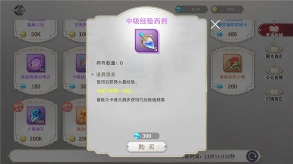 2、主城的商店里可以购买中级经验药剂,只要通过商城刷新,就能不断购买,存够足够钻石的话,等级就能快速提升!