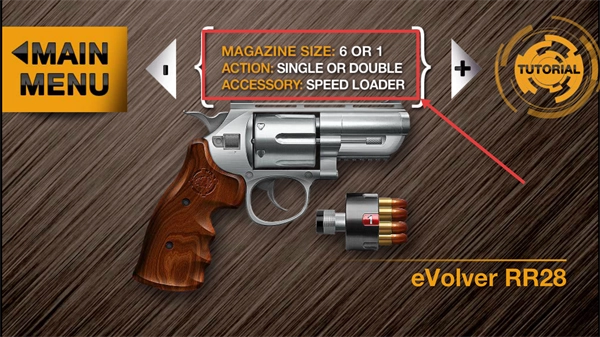 3、查看枪械参数【弹匣容量-6或1】【发射模式-单发或连发】,点击【教程】学习操作技巧。