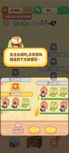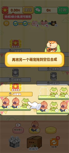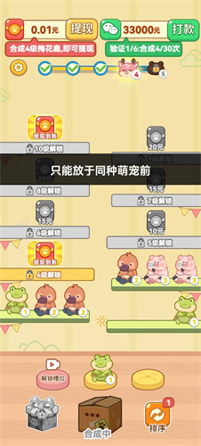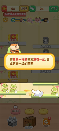 3、游戏采用合成萌宠的方式来达成提现条件,只要合成出指定的萌宠,就能直接发起提现操作,且所有红包奖励都会实时到账。