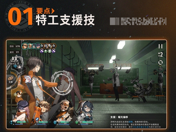 支援技效果往往是特工的标志性技能,下达支援技指令后,该技能会在后续回合的行动序列首位触发。组长们能够在恰当的时机发动支援技来改变战局走向。