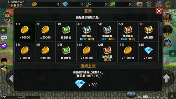 1、每天登录游戏都能领取签到奖励,只要坚持签到,就能获得丰厚的金币、钻石、服装、技能以及武器等奖励。