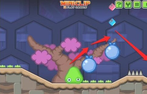 3、操控粘液跳到气球上,接着越过钉刺,下方是无法通行的!