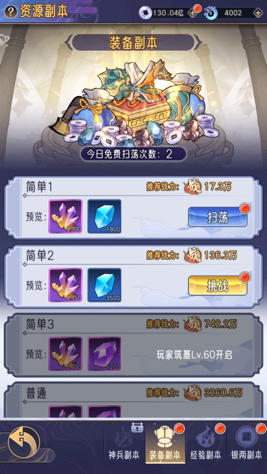 副本分为四类,分别是银两副本、经验副本、装备副本和神兵副本,并依据难度等级划分。难度越高的副本,所提供的奖励就越丰厚。各位修仙者每日拥有2次免费扫荡机会,在自身实力足够的情况下,建议优先选择奖励最为丰富的副本进行扫荡。要是免费扫荡次数耗尽,而您还希望获取相关资源,此时可以消耗灵玉来购买扫荡次数,或者升级貔貅特权。随着貔貅等级逐步提升,资源副本的购买次数也会随之增多。