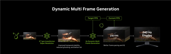 除此之外,NVIDIA DLSS 4.5技术还引入动态多帧生成功能,该系统不会采用固定的帧率倍数,而会在不同的帧率倍数之间自动切换,以便在帧率、画质和响应速度之间达到完美平衡!
