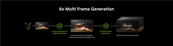 DLSS 4.5技术采用全新6倍多帧生成模式,实现了流畅度的巨大飞跃!凭借第二代 Transformer 模型的出色图像稳定性,结合帧率控制与画质的优化,DLSS 4.5技术可为每个渲染帧额外生成多达5帧,实现最高6倍的帧率提升!