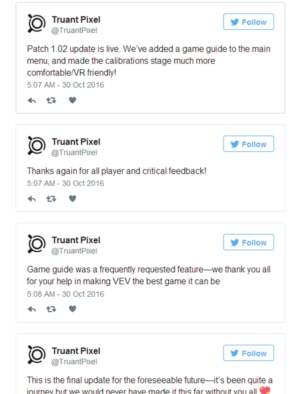 《VEV:VivaExVivo》的开发商TruantPixel于今日推出了该游戏的最终更新,相关消息已通过推特对外公布。