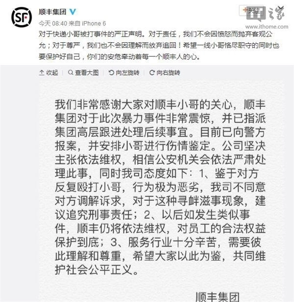 18日上午,顺丰集团通过官方微博发布声明称:“针对此次暴力事件,我们深感震惊,集团高层已被指派跟进后续处理工作。目前公司已向警方报案,并安排涉事快递员进行伤情鉴定。我们坚决支持依法维护权益,相信公安机关会对此事依法严肃处理。”