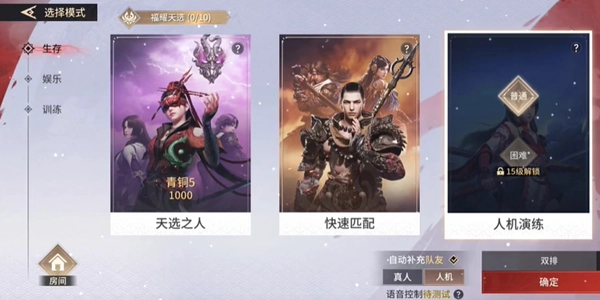 2、接下来在生存模式里,点击人机演练选项,选择双排模式,然后点击自动补充人机队友。