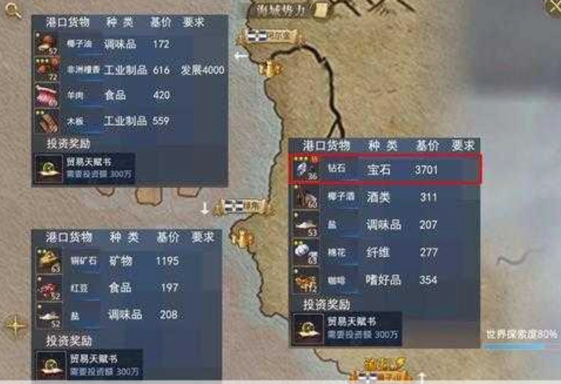 在南非金钻三港作为长途跑商地点时,所需进货的商品是金子和钻石。具体获取方式为:先前往阿比让或狮子山等地进行投资,将金子和钻石解锁。接着,拿出事先准备好的三级进货书,用它把商品全部买满,之后回到地中海地区直接售卖即可。