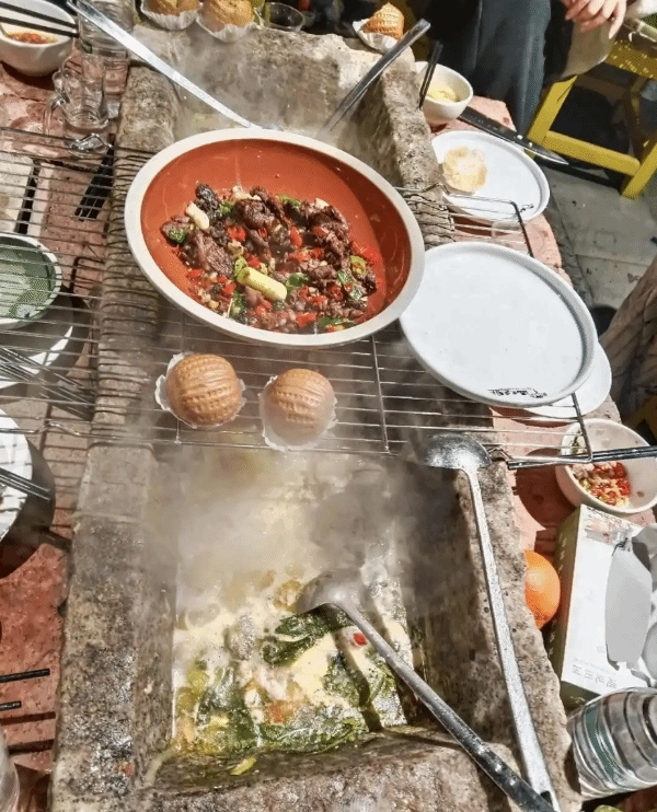 他解释道,这些石槽都经过了专门的抛光打磨处理,使用起来很安全。据了解,每口石槽锅的长度大约是90厘米,宽度约为25厘米,差不多可以供8个人同时用餐。