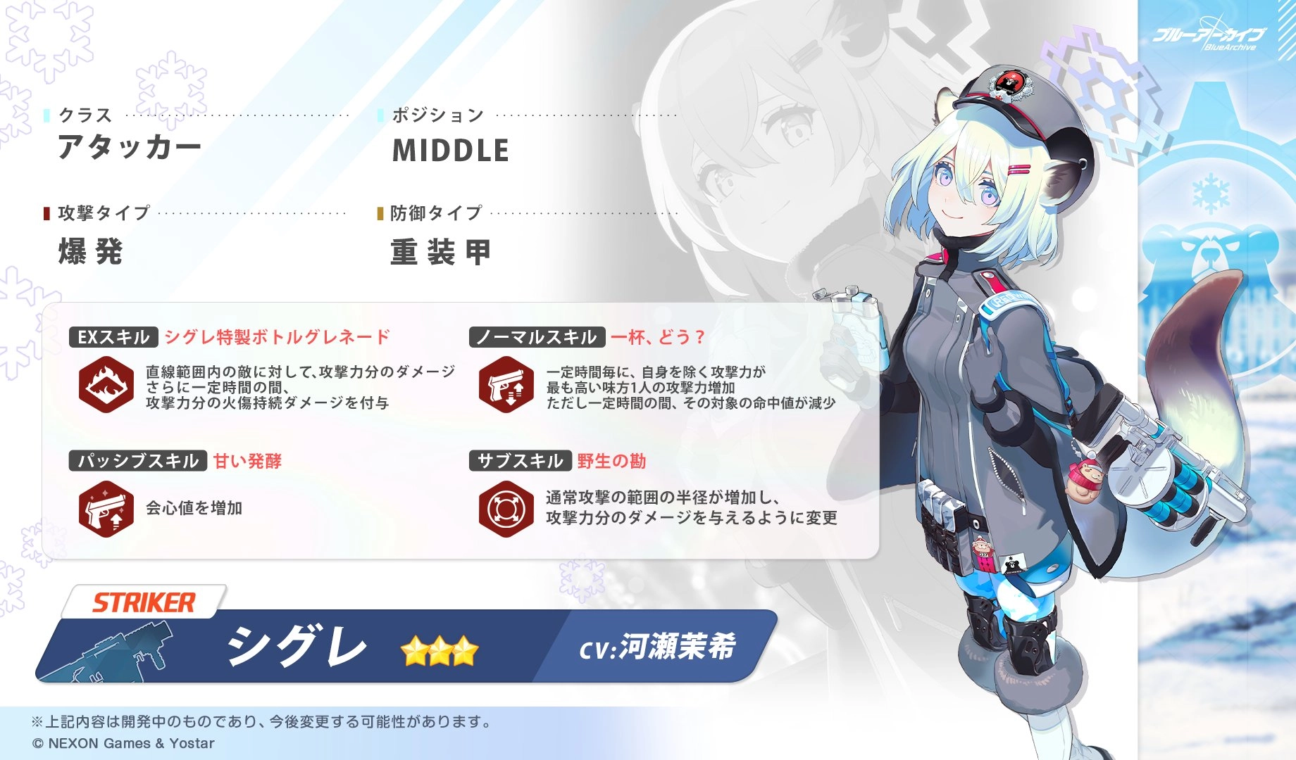 对时雨同学而言,自制饮料是他的兴趣所在。他的EX技能是朝敌人扔出特制的瓶状手榴弹,手榴弹会引发燃烧,除了造成基于攻击力百分比的伤害外,还会额外施加持续伤害效果。