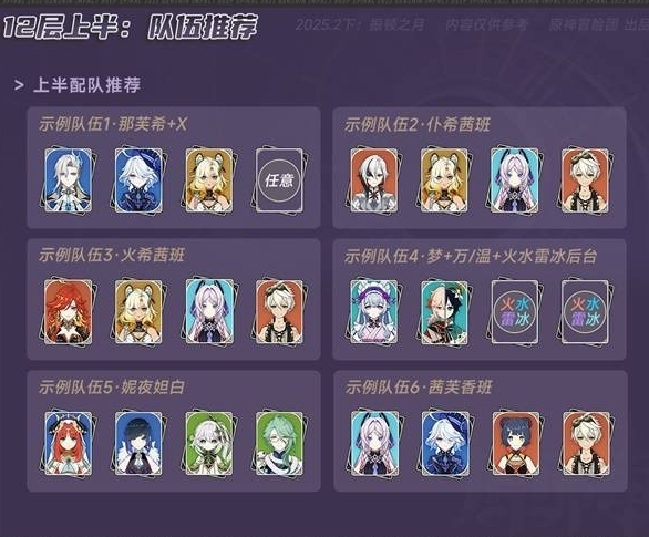 这期深渊的难度不算高,也没有特别棘手的强力机制。上半侧重应对群怪,下半则偏向处理单体敌人,只要输出能力达标就能顺利通关(不过下半第三间对练度的要求会稍微高一些)。而且随着辅助和副C角色的不断增加,很多队伍的位置都有了强力的备选角色,下面仅列出部分具有代表性的配队方案,各位旅行者还是要根据自己的角色池和个人偏好来选择合适的队伍。