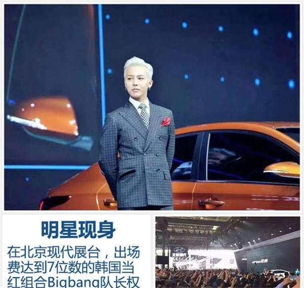 近年来车展最吸引眼球的往往是明星而非车模,回想往届韩国超人气偶像金秀贤到现场助阵产生的明星效应,几乎让现场安保环节多次失控。今年的北京车展在这方面依旧有过之而无不及,在北京现代的展台,出场费高达7位数的韩国当红组合Bigbang队长权志龙,为计划年底上市的全新悦纳代言。他身兼歌手、制作人、作曲人、作词人、潮流引领者等多重身份,更因为是Angelababy的偶像这一身份,在国内收获了超高人气。不少粉丝和歌迷花8000元购买车展工作人员的工作证,还把展馆内围堵得水泄不通,只为见只现身十分钟的权志龙欧巴一面,真可以说是“一眼万元”了。