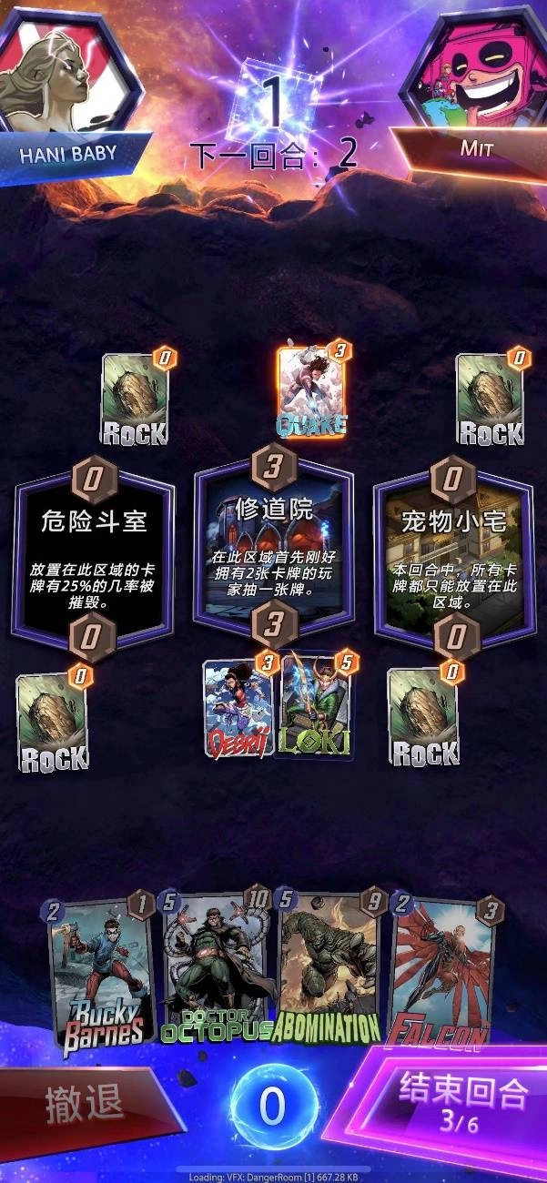 到了第三回合,不出所料,我们能看到对手将牌打在了中路。第三个场地是危险斗室,这对我方并没有明显的不利之处。所以,我们按照之前制定的计划,在中路打出洛基这张牌。凭借这一操作传递出的信息,我方差点就触发了snap。原因在于,这个时候对手并不知道我们有洛基这张牌,所以他们大概率还不会选择逃跑。