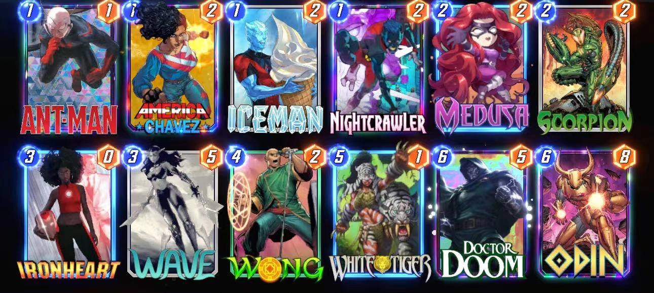 # QW50TW42LEFtcmNDaHZ6RCxJY21uNixOZ2h0Y3J3bHJDLE1kczYsU2NycG44LElybmhydDksV2h0VGdyQSxPZG40LERyRG02LFd2NCxXbmc0若要使用这套卡组,先将其复制到剪切板,接着在MARVEL SNAP里打开卡组编辑界面进行粘贴。 核心卡牌:浪、毁灭博士、奥丁。打法说明:该卡组曲线较为平滑,一般可按照费用出牌,有什么牌就打什么牌。整体存在两条路线,其一为第三回合打出浪,第四回合打出毁灭博士,第五回合打出白虎,第六回合打出奥丁,如此场上会出现众多衍生物,战力相当可观。其二是第四回合打出王,第五回合打出白虎,第六回合打出毁灭或者奥丁。这两个组合技要是能成功施展,都能获得很高的战力,实际对战中根据具体情况灵活调整就行。要是核心牌在手上,尽量提前打出snap,以实现收益最大化。