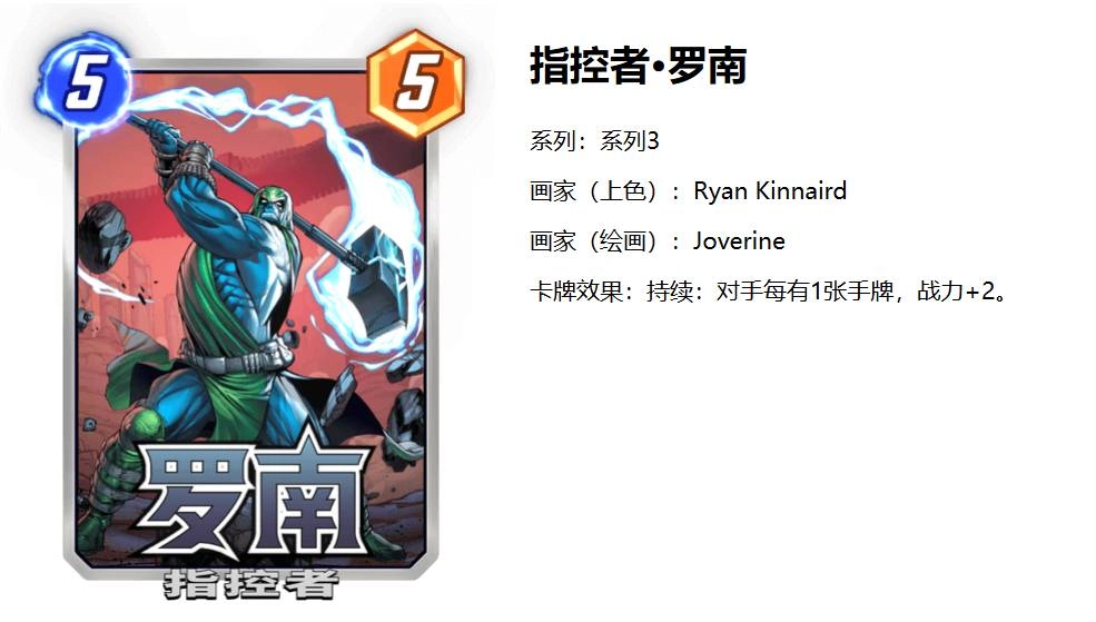 在这套卡组里,主题模组、莫多男爵、麦西穆斯以及黑寡妇这四张卡牌,能够增加对手的手牌数量,而吸收人则会让对对手造成的伤害翻倍。除此之外,卡组中还携带了寇格,用来弄脏对方的牌库;冰人可以增加对方手牌的费用;绿魔则负责污染对方的卡位。当游戏进行到第五回合时,打出罗南能获得大量战力,到第六回合,魔形女复制第二个罗南,便可赢下两路。这套卡组具有较高的娱乐性,就算不能获胜,也能给玩家带来欢乐,要是大家抽到了罗南,不妨尝试一下这套卡组哦!