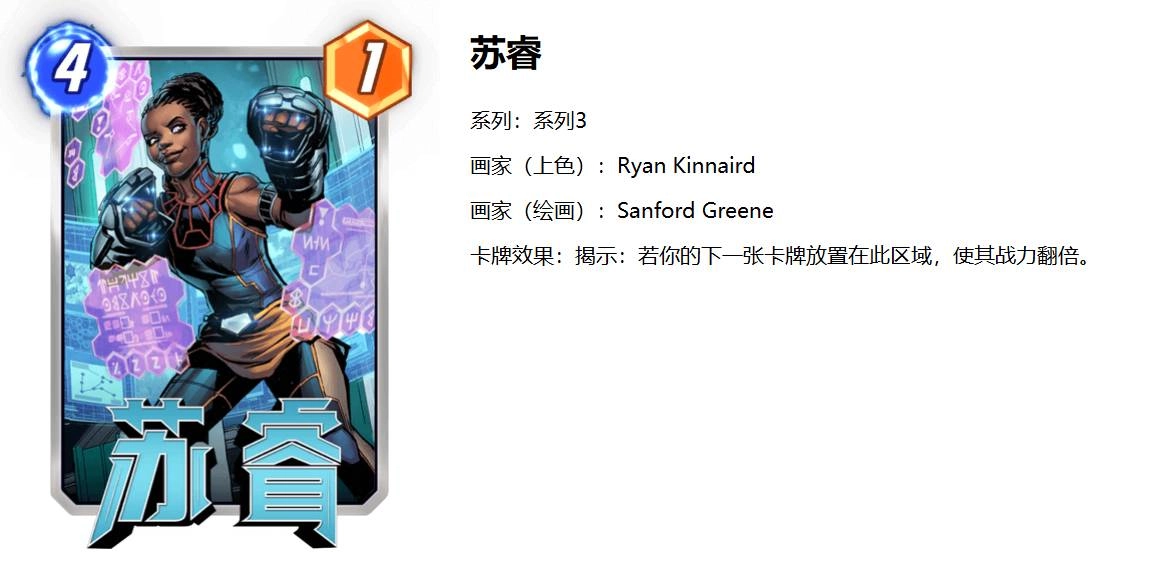 到了《复仇者联盟4:终局之战》,苏睿随着消失的那一半生物回归,并与全体英雄一同对抗灭霸。苏睿形象鲜明,聪明勇敢且充满智慧,是漫威宇宙中至关重要、鼓舞人心的角色。以上便是3DM小编整理并带来的《漫威终极逆转》新手三池苏睿卡组搭配玩法分享,想要了解更多精彩内容,欢迎点击关注firedg!