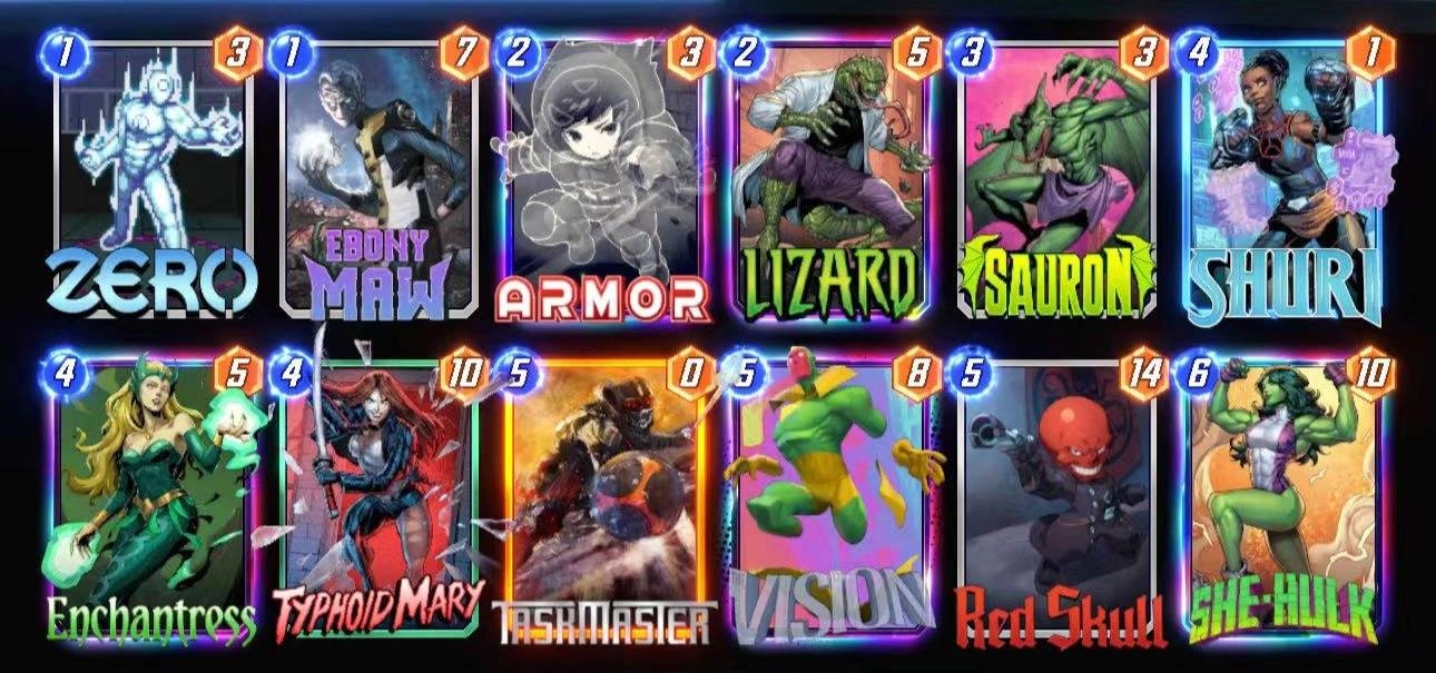 eyJDYXJkcyI6W3siQ2FyZERlZklkIjoiWmVybyJ9LHsiQ2FyZERlZklkIjoiRWJvbnlNYXcifSx7IkNhcmREZWZJZCI6IkFybW9yIn0seyJDYXJkRGVmSWQiOiJMaXphcmQifSx7IkNhcmREZWZJZCI6IlNhdXJvbiJ9LHsiQ2FyZERlZklkIjoiU2h1cmkifSx7IkNhcmREZWZJZCI6IkVuY2hhbnRyZXNzIn0seyJDYXJkRGVmSWQiOiJUeXBob2lkTWFyeSJ9LHsiQ2FyZERlZklkIjoiVGFza21hc3RlciJ9LHsiQ2FyZERlZklkIjoiVmlzaW9uIn0seyJDYXJkRGVmSWQiOiJSZWRTa3VsbCJ9LHsiQ2FyZERlZklkIjoiU2hlSHVsayJ9XX0=