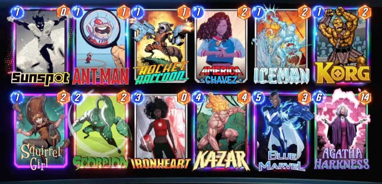 ## 要使用这套卡牌,将其复制到剪贴板,然后在《漫威Snap》的卡组编辑菜单中粘贴。关键卡牌:阿加莎、卡扎尔、蓝惊奇以及大量1费的小牌