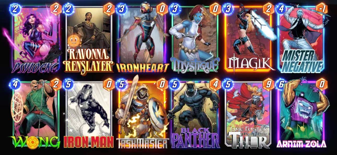 这是一套相对初级的负先生卡组,整套卡组里仅有拉芙娜这一张4池卡,要是没有拉芙娜,也能用扎布来替代,其余的全是3池及以下的卡。负先生卡组属于自闭卡组,比较理想的出牌顺序是,2费打出拉芙娜或者灵蝶,3费打出负先生,5费打出简·福斯特和神威索尔。这样操作后,手里就会有许多零费卡牌。其整体思路主要有两种,一种是钢铁侠与魔形女的combo,另一种则是王接上黑豹,最后接上电视机的组合。这两种打法一旦成功施展,都能爆发出超强战力,从而赢得比赛。