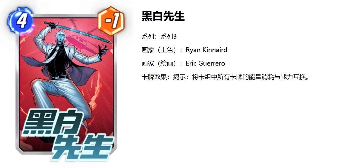 在《漫威终极逆转》里,负先生卡牌的效果设定为“揭示:将卡组中所有卡牌的能量消耗与战力进行互换”。这一别具一格的能力,为玩家开拓出一种全新的战术选择方向。当我们着手构建以负先生为核心的卡组时,必须充分考量他的技能对卡组构建所产生的影响。鉴于他的技能会使所有卡牌的能量消耗与战力相互交换,所以在构建卡组过程中,我们得用心挑选那些在交换之后能够创造出战术优势的卡牌。比如说,挑选原本战力较高但能量消耗较低的卡牌,借助负先生的技能,这些卡牌便能在消耗较少能量的情形下,发挥出更为显著的作用。在具体玩法方面,负先生卡组或许需要尽快施展出负先生的揭示技能,从而实现最佳效果。接下来,为大家介绍一套面向新手的3池版本负先生卡组。