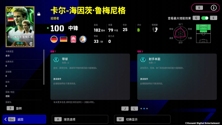 鲁梅尼格增能属性为【带球 +2】,速度和盘球的增强让他的脚下如风,突破重重防线!