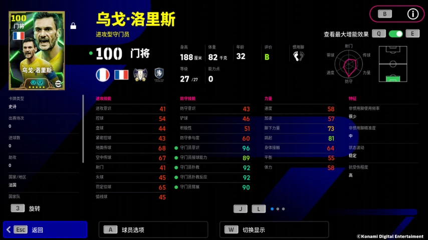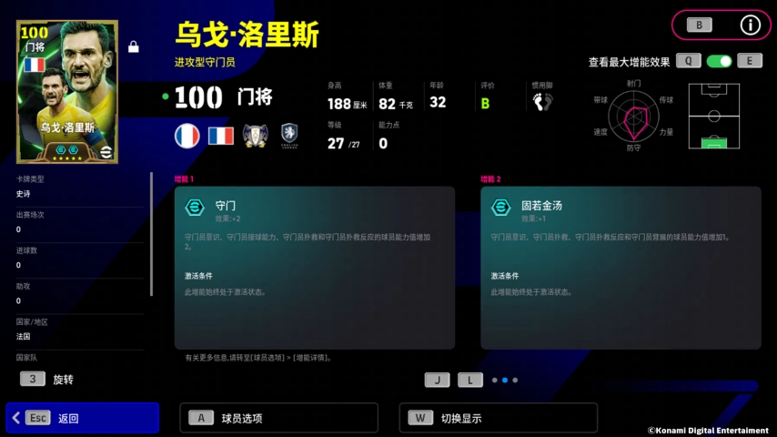 洛里斯增能属性为【守门 +2】,守门能力的全面提升让他在门线上屡献神扑!